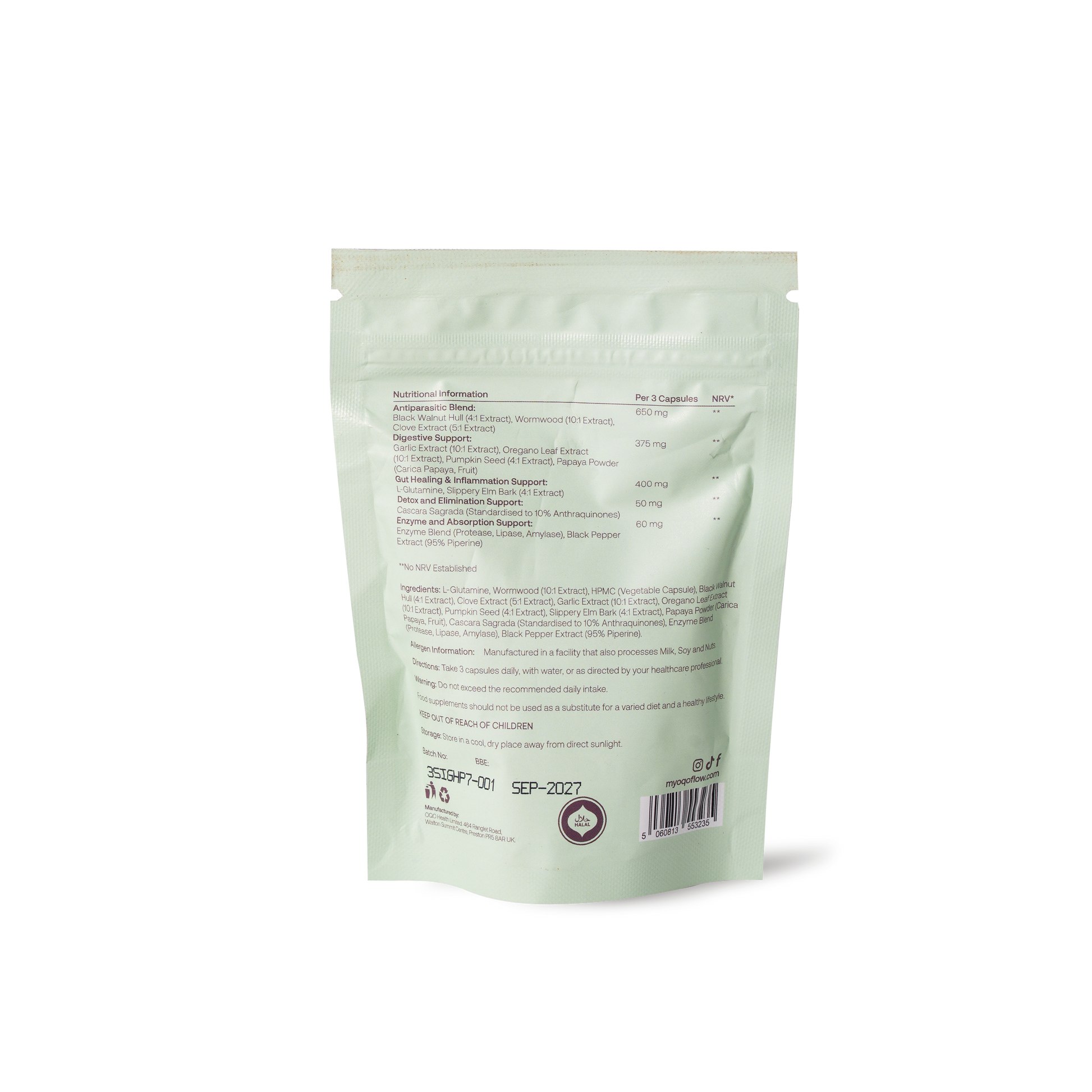 L-Glutamine, Wormwood (10:1 Extract), HPMC (Vegetable Capsule), Black Walnut Hull (4:1 Extract), Clove Extract (5:1 Extract), Garlic Extract (10:1 Extract), Oregano Leaf Extract (10:1 Extract), Pumpkin Seed (4:1 Extract), Slippery Elm Bark (4:1 Extract), Papaya Powder (Carica Papaya, Fruit), Cascara Sagrada (Standardised to 10% Anthraquinones), Enzyme Blend (Protease, Lipase, Amylase), Black Pepper Extract (95% Piperine).